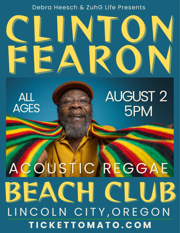 Debra Heesch & ZuhG Life Present CLINTON FEARON Solo Acoustic Reggae on August 2nd at the Beach Club in Lincoln City, Oregon. All Ages are Welcome.