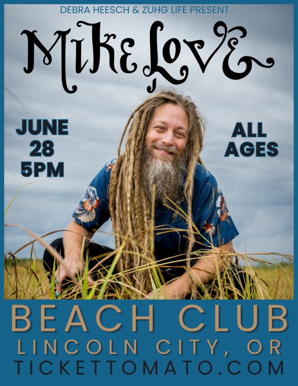 Debra Heesch & ZuhG Life Present MIKE LOVE solo acoustic reggae on June 28th at The Beach Club in Lincoln City, Oregon. Early show at 5 pm, Tickets are $20 if purchased in advance or $25 on the day of the show, all ages are welcome.