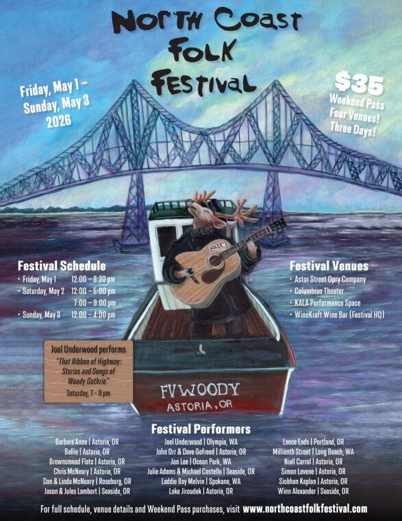 North Coast Folk Festival is a brand new, first-ever, (aspiring) yearly music event that celebrates folk musicians and folk music on the north coast. It features a selection of folk musicians from all over the Pacific Northwest performing at three different venues over the course of two days in Astoria, Oregon.